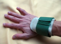 Handgelenk-Stütze Boden- und Pauschenpferd-Turnen mit 3 cm oder 5 cm breitem Verschlussband, graues/weißes Leder